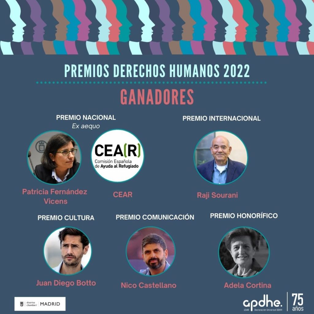 Después de un proceso de votación abierta y posterior deliberación de un jurado independiente, la APDHE ha hecho público los galardones de este año 2022. Esta es la 40ª edición de estos premios anuales que se otorgan en las categorías de Nacional, Internacional, Comunicación y Cultura para reconocer a personas, organizaciones e instituciones que vienen desarrollando acciones y trabajos por el respeto por los DDHH desde la más absoluta integridad y generosidad.
