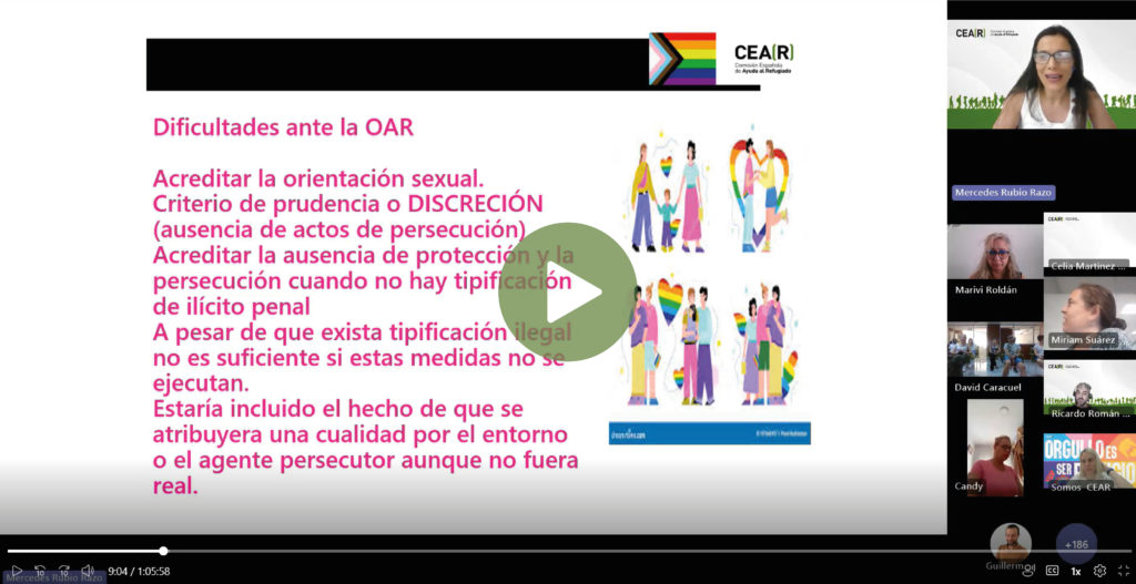 Mercedes Rubio, abogada de CEAR y directora del centro de Torreblanca (Sevilla), repasó la evolución del reconocimiento de la protección internacional por motivos de orientación sexual e identidad de género en España. Subrayó los avances alcanzados, pero también los retos que aún enfrentamos para garantizar un acceso real y digno a los derechos.