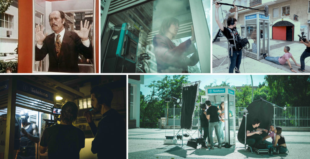 Los 4 cortometrajes se rodaron en una sola jornada desde por la mañana hasta altas horas de la noche, en una localización mítica del cine español cerca de la M–30 en Madrid, a la que hubo que trasladar la cabina de teléfono. Un elemento protagonista que acompañó las actuaciones y que supuso un reto a la hora de rodar. Para atrancar sus puertas y dejar atrapadas a sus protagonistas se probaron diferentes métodos y al final el más efectivo requirió la ayuda de una de las personas del equipo que improvisó echándose al suelo. El traje que viste la actriz Nathalie Poza está inspirado a su vez en el que vestía José Luis López Vázquez en la película original.