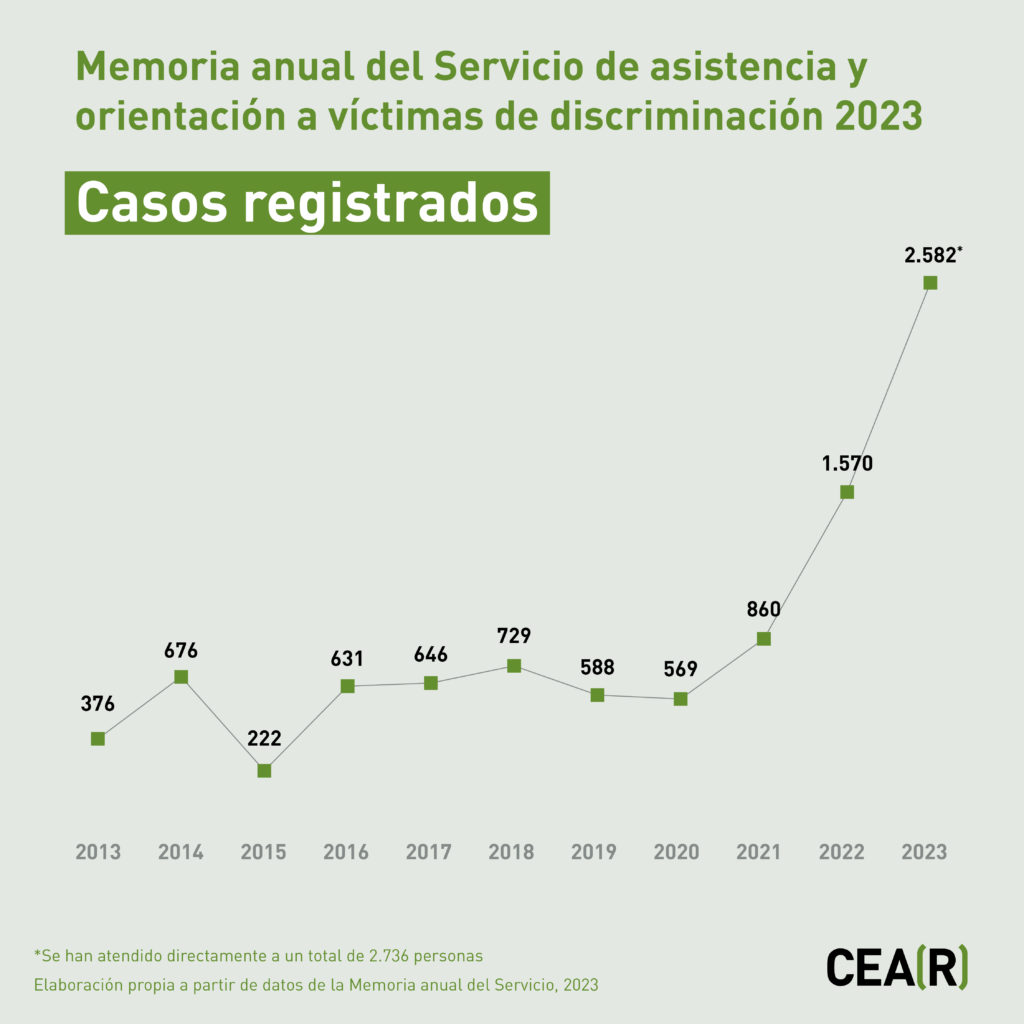 En octubre de 2024, se publicó la Memoria del Servicio de Asistencia y Orientación a Víctimas de Discriminación Racial o Étnica del CEDRE, del que formamos parte en CEAR con la atención de casos en nuestras oficinas de Málaga y Las Palmas de Gran Canaria. Se plasma un incremento significativo en los incidentes atendidos: un total de 2.582, a través de las 23 oficinas del Servicio y el teléfono gratuito del 021.