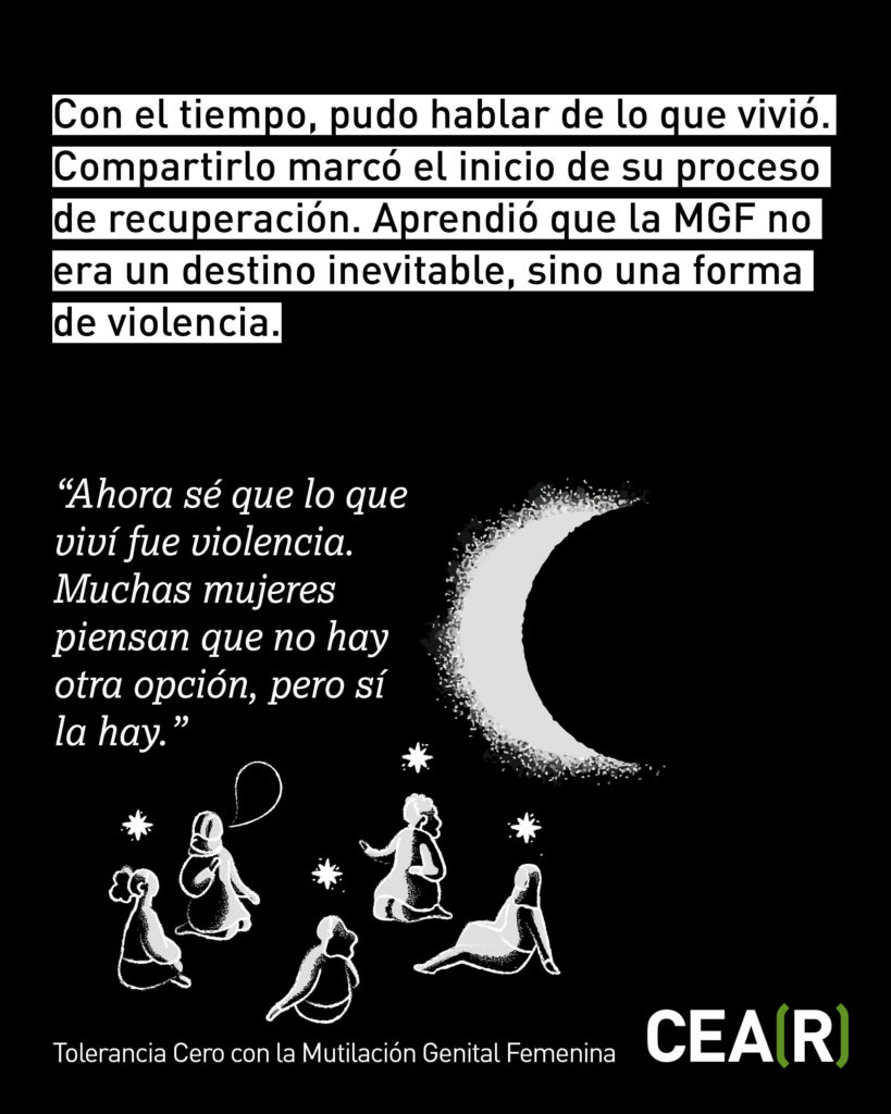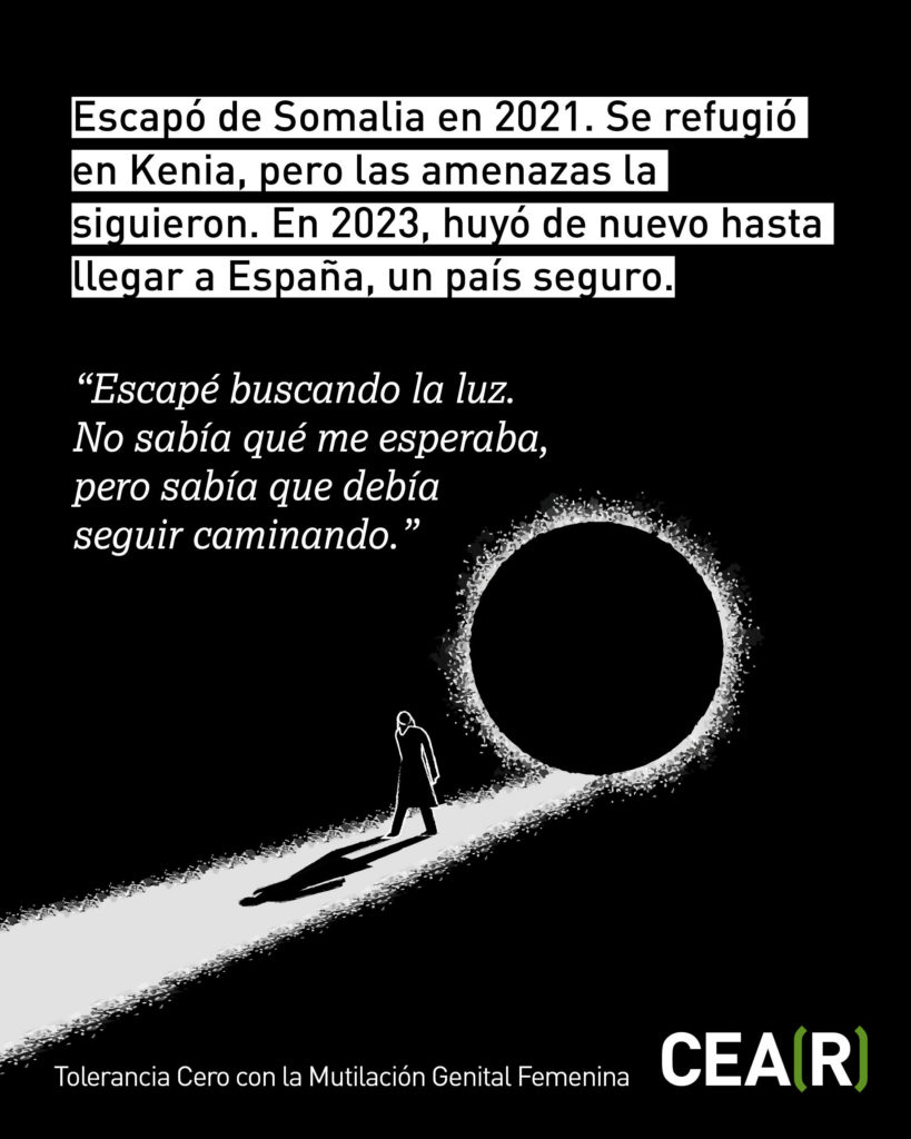 Amina cruzó la ruta atlántica arriesgando su vida para huir de la violencia y proteger a su hija de la MGF. Su recuperación ha sido un proceso largo, acompañado por profesionales que han validado su historia y su dolor.